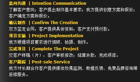 保證力——作業(yè)流程 我們一直相信,只有科學、規(guī)范的作業(yè)流程作為運作保障,優(yōu)秀的創(chuàng)意才能得以完美的實施。在經典影視,我們一直秉承——策略精準 . 創(chuàng)意新銳 . 執(zhí)行出色。